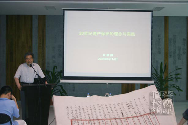 2008年6月14日,正值我国第三个“文化遗产日”。国家文物局局长单霁翔应邀到我馆的“鲁博论坛”作了题为《20世纪遗产?;さ睦砟钣胧导返闹魈庋萁病1本┞逞覆┪锕莨莩に镉糁鞒致厶?。鲁迅博物馆全体员工,文博界、文化界相关人士,大中学生等共约一百五十人参加了论坛。