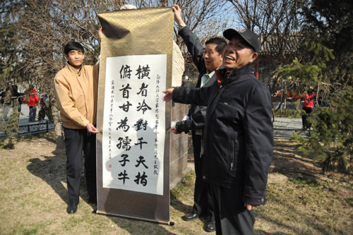 这次活动首先把今年的3月5日至4月5日定为鲁迅纪念月,金融街老协18个街道近800人走进了北京鲁迅博物馆。为了更好的照顾这些“老邻居”,我们与金融街老协做了详尽的参观预案,对前来参观的老人按年龄、体力分组参观,此外,我们还通过组织知识问答、朗诵、鲜花等形式,和老人们进行互动活动,保证老人们安全、快乐的出游。宏汇园等街道的老人们还为鲁迅像赠献了鲜花、献词,想我馆赠送了书法、绘画和手工艺品,北京鲁迅博物馆赵国顺副书记代表我馆接受了老人们的捐赠。同时,我馆还向老协的老人们赠送了鲁迅知识普及读物。这些互动活动与纪念仪式为鲁迅纪念月平添了一抹温馨的底色。