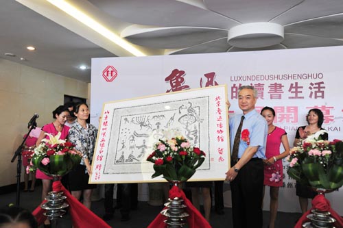 展览开幕式由滕州市副市长张宪依主持,滕州市委常委、宣传部部长刘光、滕州市文广新局局长贾福军、我馆馆长杨阳等出席开幕式,发言并为展览剪彩。仪式上,北京鲁迅博物馆馆长杨阳向汉画像石馆赠送了《鲁迅全集》,汉画像石馆回赠了馆藏精品拓片。