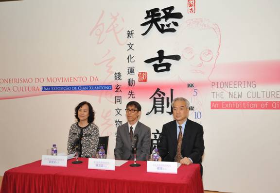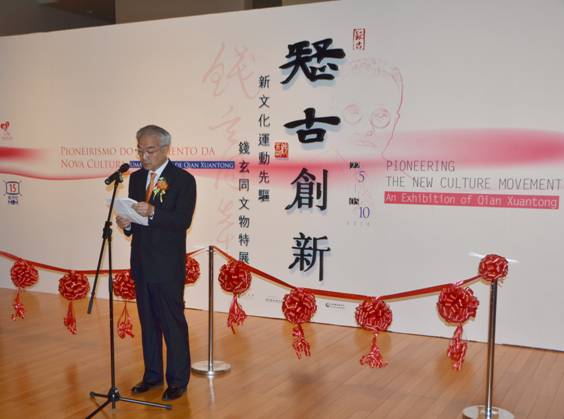 2014年5月19日下午四点,在澳门回归贺礼陈列馆专题展览厅举行了该展的新闻发布会,三馆馆长分别致辞并回答了记者提问。 5月21日下午六点半举办了“疑古创新——新文化运动先驱钱玄同文物特展”开幕式。澳门民政总署管委会副主席罗永德、中联办文教部副部长张晓光、北京新文化运动纪念馆馆长郭俊英、北京鲁迅博物馆馆长杨阳及澳门文化教育出版界人士出席了开幕式,罗永德、郭俊英、杨阳分别致开幕词。罗永德致词称,此展以日记、照片、信札、书法、学术文稿等为主,展出钱玄同本人文物外,还有章太炎、鲁迅、胡适、周作人、沈尹默等名人书法、信札等,让观众回顾近代大思潮中文化巨匠的风范和心迹;透过展览向观众介绍中国近现代文化发展起源,对中华文化的百年演变有所了解。郭俊英致辞称,今年是五四运动九十五周年,也是澳门回归祖国十五周年,令此展更富意义。钱玄同生于书香门第,从小受到严格的传统文化教育。其文字音韵学既得章太炎真传,又综合诸家之长,卓然成为音韵学界“古今中外派”的集大成者。杨阳指出,钱玄同的个性有两大特点,一是勇于挑战自我,思想活跃,与时俱进。二是吾爱吾师,吾更爱真理。他敬爱他的老师,情谊深挚,但他一反章太炎古文家数而崇今文,章太炎反对白话文,他却斥文言为“选学妖孽,桐城谬种”,坚决主张白话文??皇胶?,澳门艺术博物馆馆长陈浩星陪同来宾参观了展览?!栋拿湃毡ā返榷嗉野拿琶教宥源舜位疃辛吮ǖ馈?br />