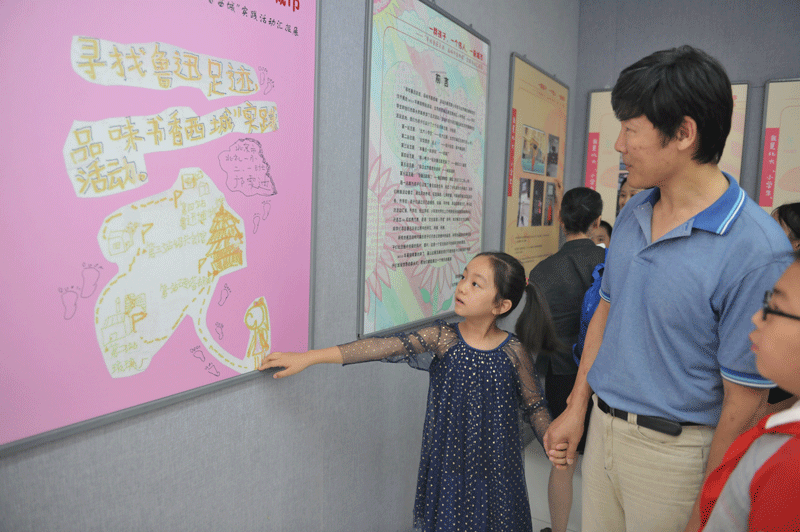 在这次展览中,所有的展览说明均摘自孩子们行走记录册中的语言,所有的画面也均来自孩子们纪念册中拍摄的照片、图片——这是一个完全由孩子的视角主导的展览。因此,展览开幕式也完全围绕孩子展开。进步小学张卜心同学、奋斗小学蒋翊峥同学的纪录片开启了这个特殊的开幕式;北青社区报西直门小记者站的小记者对参加活动的文化小使者的现场采访:当小记者们问李圣一同学为什么一定要让姥姥在砖塔之前拍照时,李圣一同学回答说:“参加寻访活动一路都是姥姥给我拍照片,因为这座砖塔叫‘万松老人塔’,我就觉得一定要给姥姥拍照片,祝她健康长寿。”刘雨菲同学在纪念册里号称的“比鲁迅帅多了”的爸爸也终于在采访中亮相。雨菲爸爸风趣的说:“前一段股市大跌心情很差,可是参加这个活动、观看这个展览却给了我惊喜,平时不要说孩子,就是大人也经常围着电脑、手机这样的电子产品转,很少读书。通过我带着孩子参加这次活动,到鲁迅的足迹地寻访,找资料、查书、拍照片,让我们大人和孩子一起有了一次亲近书籍、亲近伟人的机会,也让我们通过寻访伟人的足迹更了解这个城市。看到展览中的内容,孩子们画的画、写的文章比我们大人还棒,真是非??模?rdquo;采访仪式后,孩子和家长们与领导老师一起,在展览的最后一个版面——“鲁迅足迹,一路有我”签名墙上签名,为这个特殊的展览画上完美的句号。