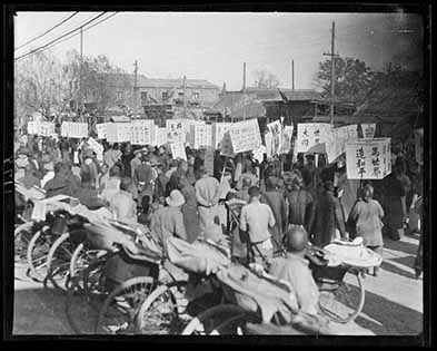 4、总统府前抗议甘博有3张照片记录了6月28日的请愿活动。据报载,6月27日下午1点左右,山东请愿团、北京中等以上学校学生联合会代表请愿团、京师总商会、在京的留日学生、报界、基督教、陕西学生联合会等各界人士四五百人,手执旗帜,来到总统府(新华门)请愿。各界推出代表7人,向总统提出“不要在欧洲和约签字”等三项要求。但从中午到下午,一直未得到总统接见。晚上11点,代理内阁总理龚心湛才接见各界代表,他表示会向总统汇报,劝各代表散去,但各代表坚持表示要见总统,于是代表留宿颐年堂,其余请愿人员,主要为学生,露宿于新华门外。直到次日上午9时,总统徐世昌才接见了请愿团代表,表示已电令外交总长陆征祥切实保留山东权利,否则不签字,谈话进行了将近两小时,在得到龚声明政府定竭尽全力后代表才出来向学生报告。但学生仍未散去。此时天津代表赶到北京,与北京代表合在一处。当晚六点徐世昌接见天津代表,再次表示山东问题持保留主义,座谈一小时,代表始出。到晚上八点,所有代表和学生才散去。[11]当时媒体报道请愿学生有150余人,包括两名女生,他们在新华门前停留三十个小时,仅食面包及汽水少许。[12]