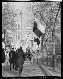 3、11月15日西什库教堂祈祷大会11月15日上午,为庆祝一战胜利,北京各国公使在西什库教堂举行战捷告祭祈祷大会。据报纸记载,这是协约各国召集本国官商侨民举行的活动,无论老幼贫富一律到堂祈祷。[3]活动还邀请了中国政界要人,外交总长陆徵祥、参议院院长梁士诒、原国务总理段祺瑞及孙宝琦等参加了活动。[4]甘博共有6张照片记录了这次活动(图6、7)。需要指出的是,甘博这组照片的说明是“11月13日胜利庆典”,而照片编号却排在11月14日的学界游行之后,实际上这次活动发生在11月15日。在这组照片中,有一张照片(图8)拍摄的是中华门(1959年拆除,现址为毛主席纪念堂)前的牌楼。据报载,这是一战胜利后北京政府内务部募集工匠搭建的最新式的花彩牌楼,装有电灯,牌楼顶上悬挂各参战国国旗,翻飞掩映,非常壮观。[5]从照片可以看出,坊额为“公理战胜”。