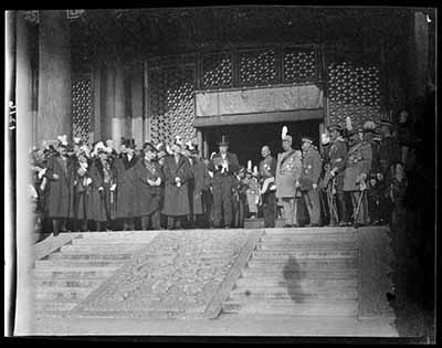 4、11月28日总统大阅兵北京政府方面决定于11月28日在紫禁城太和殿举行欧战胜利庆典,检阅各国军队。据记载,当天上午10点15分,中、英、美、法、比利时、日本、印度、安南等八国军队将近万人列队于太和殿下,等候检阅。同时,观礼群众和嘉宾在10点30前在太和殿集合,其中女宾在太和殿前二层台阶上东首集合,各国公使参赞等嘉宾在太和门集合。10点50分,总统徐世昌抵达太和门,等候在此的中外嘉宾随同总统巡阅中外部队。然后总统登上太和殿,美、日、英、法、比、中各国官兵分两行手持国旗登上太和殿。总统向各国国旗鞠躬致敬,并发表致词。致词结束,总统与各军官行握手礼后退入中和殿。捧旗官兵由西边台阶归队,中外军队列队出天安门。当天还有南苑航空学校飞艇两艘,在空中回翔,抛下各国国旗。同时有军用鸽数百只飞鸣空中。中外男女来宾参观者多至数千人。[6]