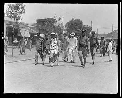 据甘博的记述,从5日的晚上起,政府就向学生表示屈服,撤销了对北大法科的守卫,但是学生并不肯离开。他们还在临时监禁处成立几个委员会,其中一个负责法科门口的治安。如果没有正当理由的话,所有学生不能离开这里,访客也不能进来。所有访客被要求告知姓名、住址、事由,才能发给一个通行证,进入法科校园。进去之后需要由一个专门的人陪同去找学生的领导再拿一个通行证才能离开。这组照片中有两张照片拍摄地点为北大法科门口,既有持枪的军警,也有带礼帽、穿长衫的学生,这些学生可能就是负责维持治安的(图23)。