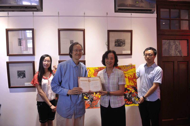 王炜先生在捐赠仪式上说:“今年是抗日战争胜利七十周年,出于对创造抗战木刻前辈的崇敬,又受北京鲁迅博物馆(北京新文化运动纪念馆)举办的中国战斗抗战木刻展的激发,创作了这幅版画。”郭俊英馆长对王炜先生的捐赠表示感谢,她说:“这是有意义的捐赠,既是对我馆成功举办中国战斗抗战木刻的祝贺,又是为这个展览即将赴各地巡展的壮行。” 郭俊英馆长向王炜先生颁发收藏证书。