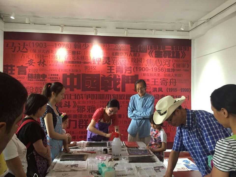 王炜先生捐赠的丝网版画名为 “刻痕――向抗战木刻致敬”。当这幅纵70cm,横140cm的大幅版画展在观众面前的时候,它浓烈的色彩,丰富的内容,一下攫住了观众的目光。他们纷纷上前端详,有的观众还向王炜先提问作品内容和作意。王炜先生作了解答:“画幅当中像枪刺一样竖立的是一柄木刻刀,象征木刻家以刻刀为武器投身抗战洪流的不屈精神,以及抗战木刻为抗战胜利建立的不朽功绩。周围则刻有彦涵,荒烟,王琦等人的名作,和重要书刊文献,整幅画面则以黄红两色飘动着浓烈的火焰,象征抗战木刻是在抗战的烽火硝烟的冶炼中,凤凰涅槃,达到艺术的高峰。”仪式后,王炜先生还参加了我馆组织的观众互动体验活动——木版水印版画,并现场进行指导,启发他们对版画的兴趣。北京鲁迅博物馆(北京新文化运动纪念馆)