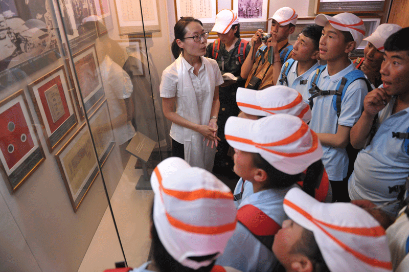 讲解员赵雪为中学生讲解五四新文化运动有关内容