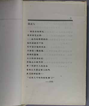 冯至的《昨日之歌》作为《沉钟丛刊》的第二种,由北新书局于1927年4月出版,共印行1500册。全书分上下两卷,上卷收抒情短诗46首,下卷收爱情叙事诗4首,作于1921~l926年。整部诗集以歌颂青春、歌颂爱情为主题。语言朴质,少修饰,却牵出缕缕真挚、浓郁的情愫。