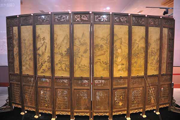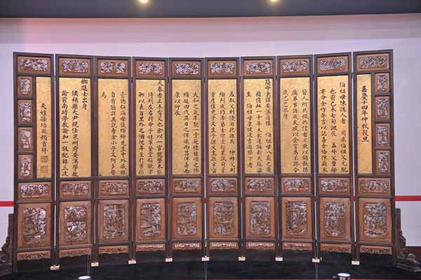 《鸡翅木镶嵌黄杨木花鸟人物祝寿围屏》 此屏为清嘉庆十四年(1809)安溪学教谕邓培风送与其伯祖母八十大寿的贺礼。屏心红底金漆,阴刻祝寿骈文,描述了伯祖母家族昌盛、子孙绕膝的盛景。寿屏长260 cm,高146.5 cm,宽2 cm,用料考究,鸡翅木为框,内嵌黄杨木透雕板。“路路连科”、“喜上眉梢”、 “八仙贺寿”,奇花异草,仙道人物无不流露着对生活的期望。下阶雕刻二十幅人物故事,“李白爱酒”、“王羲之爱鹅”、“谢安闻捷”栩栩如生,无不展示着文人雅士不烦的气度和风范。屏心刻有一篇邓培风于嘉庆十四年为其伯祖母陈孺人八十大寿所撰的祝寿辞。屏风背面为山水风景画,诗情画意,雅俗共赏,充分展示了福建金漆木雕独特的艺术魅力和深厚的文化底蕴。