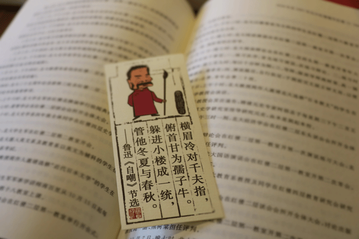 刘欣以此为底本,绘出了鲁迅读书、演讲、行路、战斗的漫画形象,配以鲁迅名言,制成书签、尺子、笔袋等系列产品。
