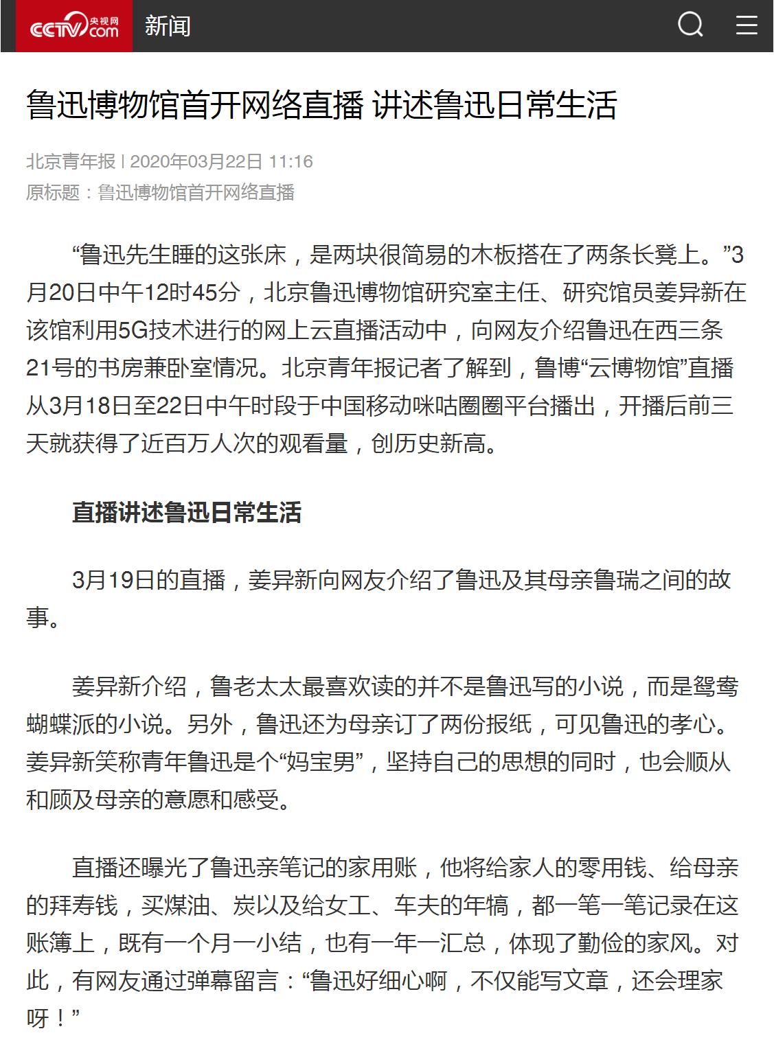 北京鲁迅博物馆首开网络直播仅三天就创下近百万人次收看量