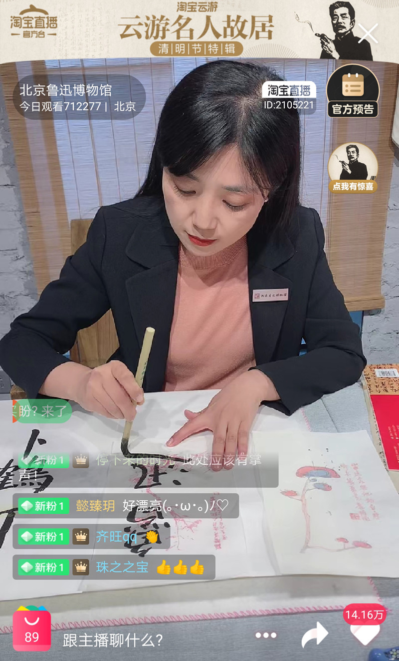 4月5日,北京鲁迅博物馆联手淘宝网进行了长达2个多小时的“清明时节怀鲁迅”直播活动,在线观众观看人数达73余万人次、互动量16.4万人次。