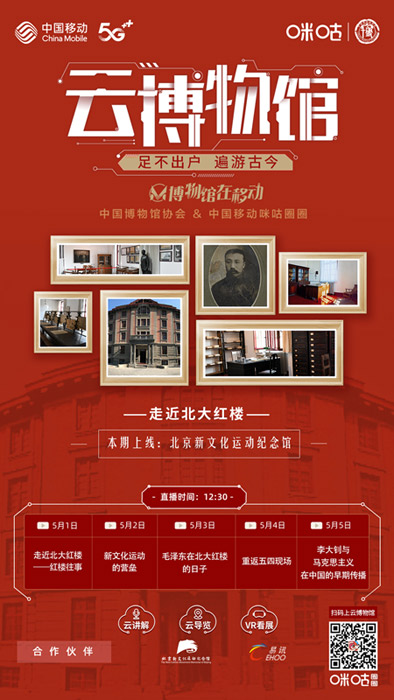我馆利用“五一”小长假、特别是五四运动101周年,在北大红楼进行了为期5天的“云博物馆”网上直播活动。5天直播在线观看人数总计达1703万人,5月4日单场在线观看人数498万人,无论是单场观看峰值,还是5天观看总人数,继全国16个博物馆(院)、纪念馆57期“云博物馆”网上直播后,再创新绩。