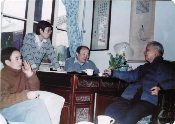 1989年春节在王瑶先生家书桌前(右起:王瑶、钱理群、陈平原、温儒敏)(夏晓虹摄)